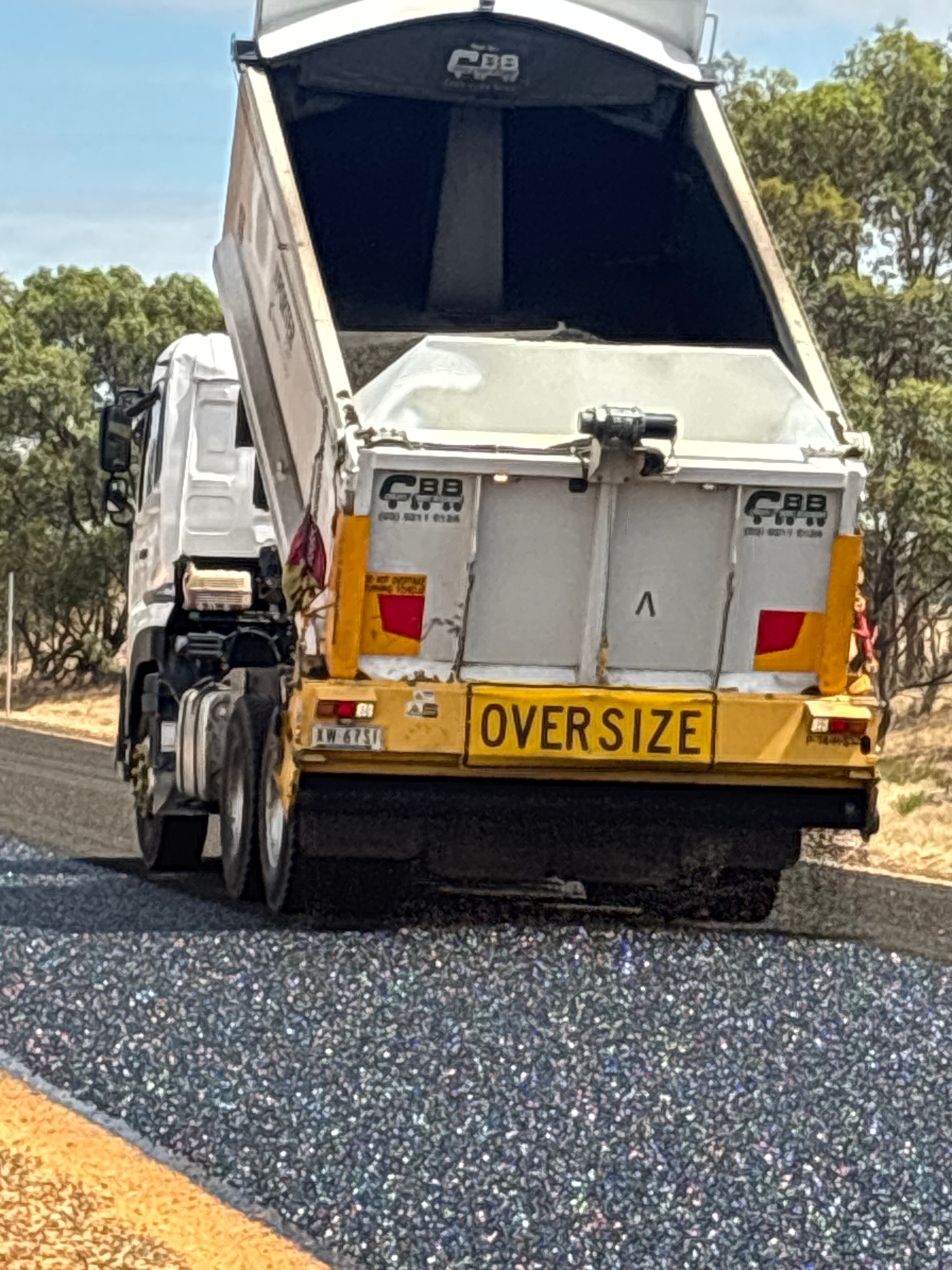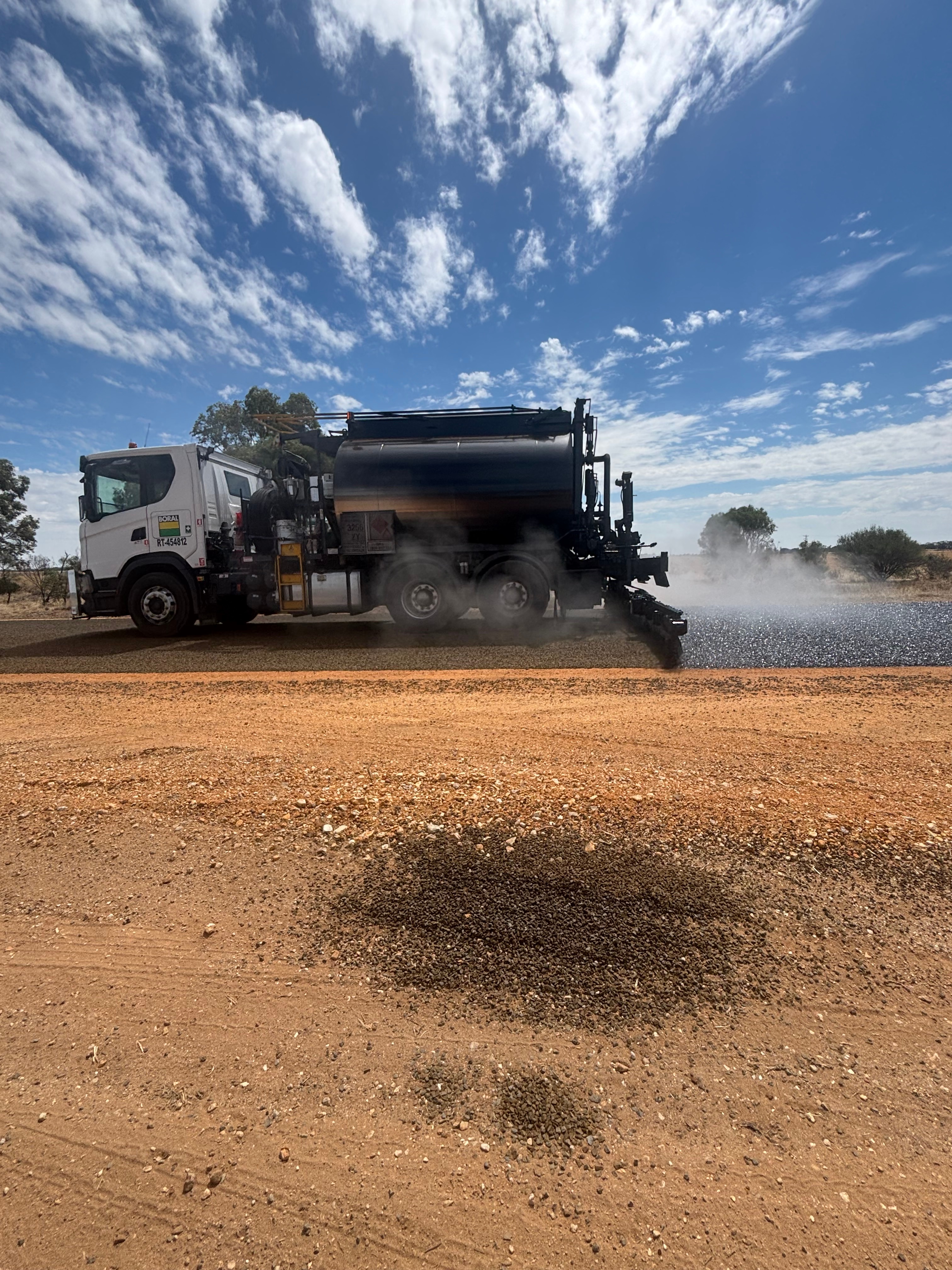 P127 - Combined teams continuing full road rehabilitation construction works on Banyena-Pimpinio Road - this week completing the road seal (images below).